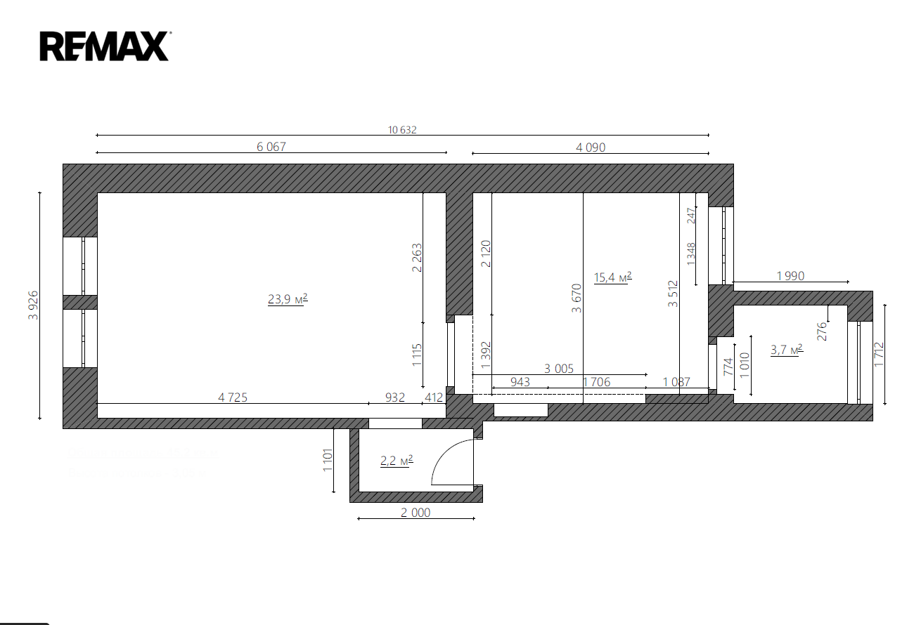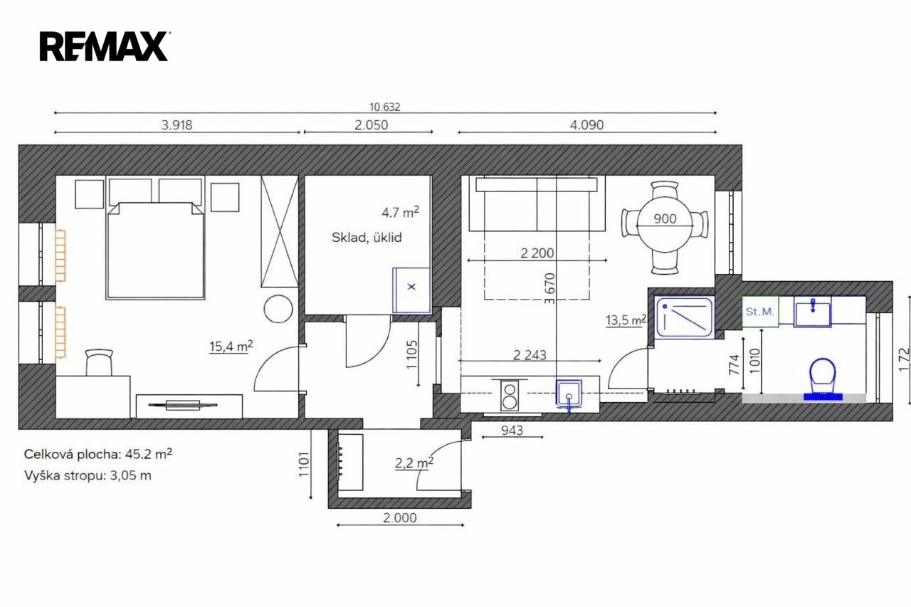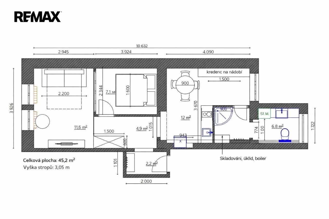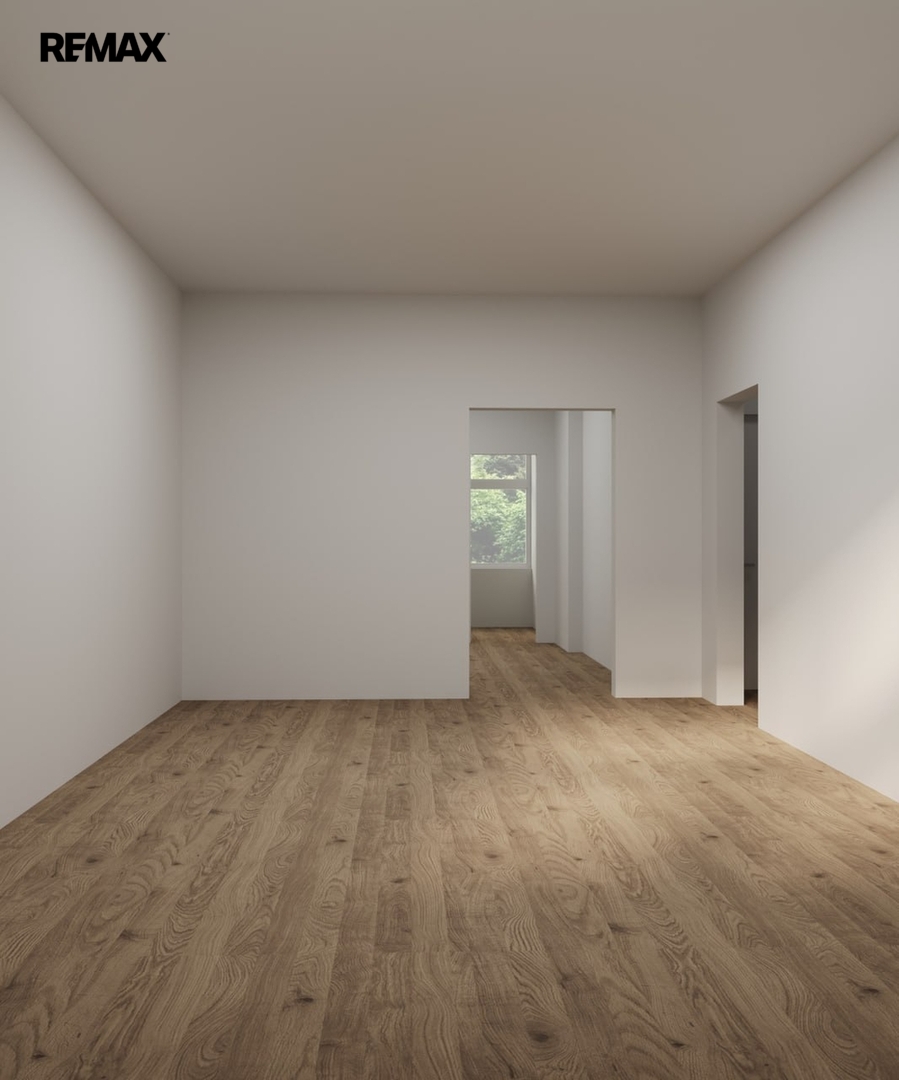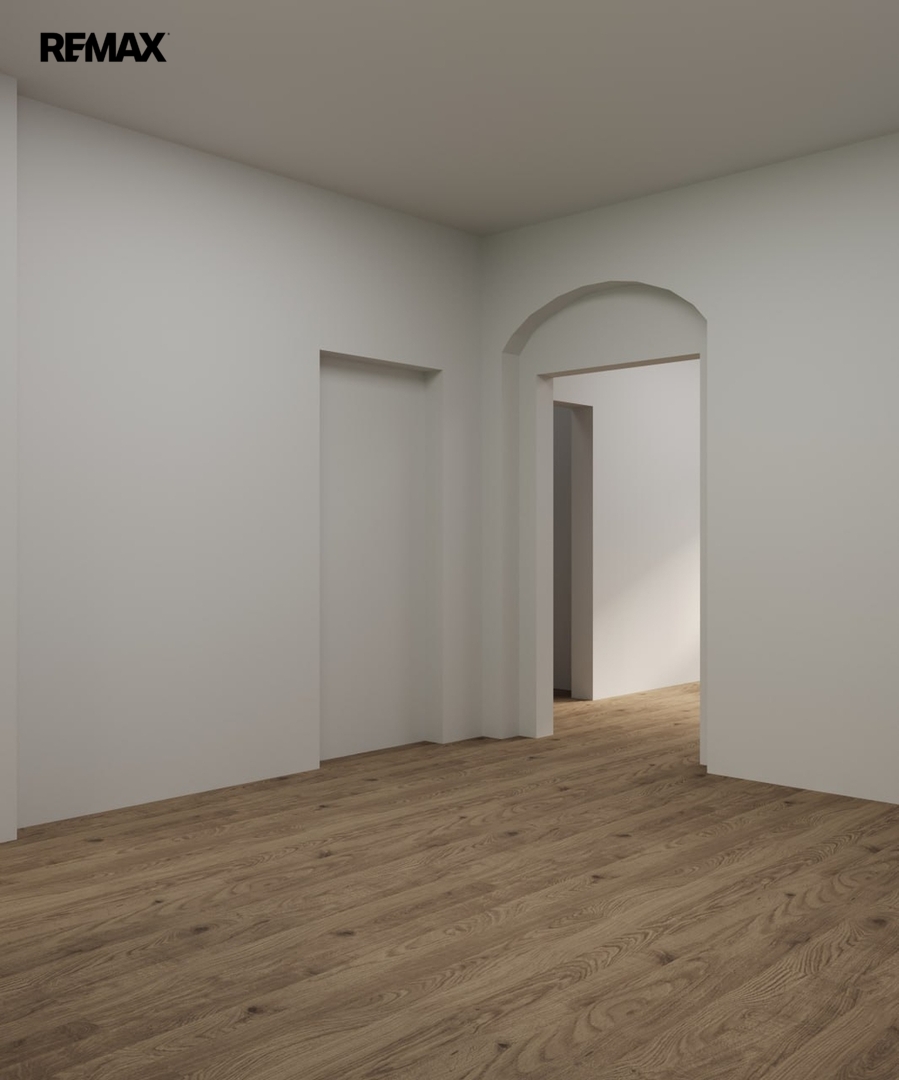 Byt se nachází ve 2. patře (3. NP) a jeho hlavní předností jsou vysoké stropy 3,05 m,