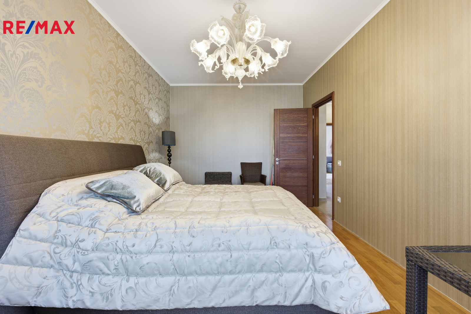 Byt je kompletně vybaven a připraven k okamžitému nastěhování. Interiéru dominují masivní interiérové dveře, kvalitní dřevěné parkety a elegantní křišťálové lustry, které dodávají prostoru nádech luxusu. Kuchyň je vybavena moderními spotřebiči, včetně nové myčky nádobí a nové trouby.