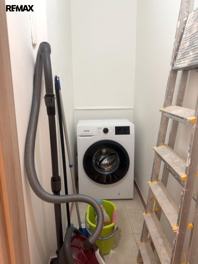Byt je vybaven novou kuchyňskou linkou se spotřebiči (lednice, pračka).