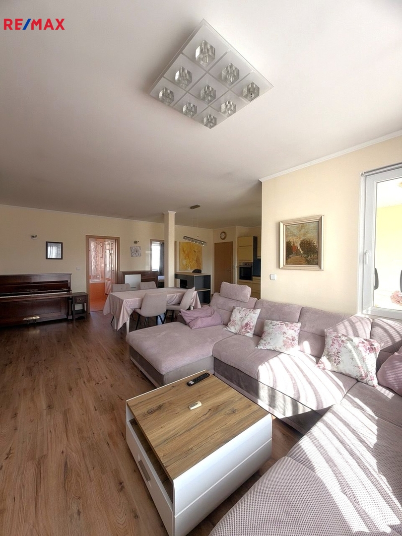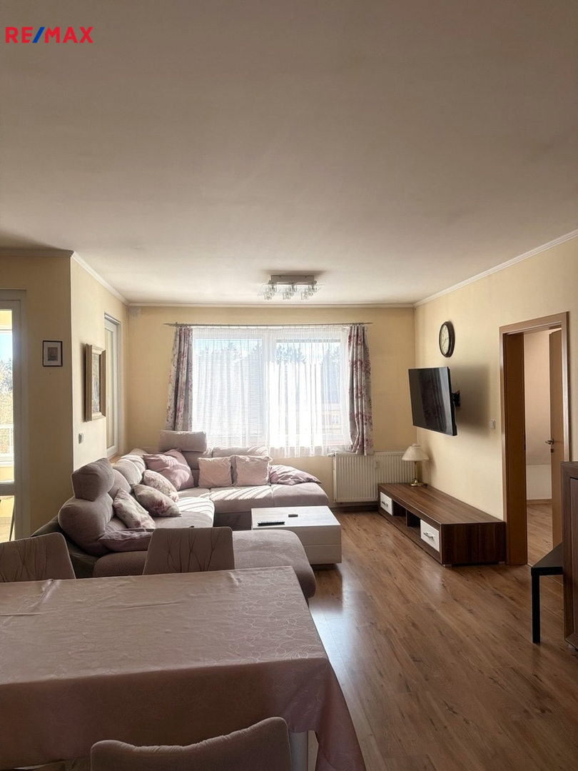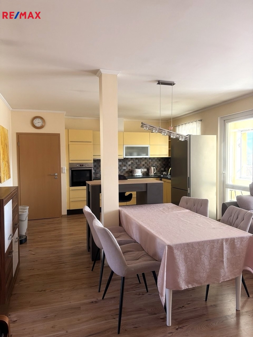 Byt disponuje prostorným obývacím pokojem s plně vybavenou kuchyní, třemi ložnicemi, dvěma toaletami a koupelnou s velkou vanou. Příjemným bonusem je prostorný balkon s krásným výhledem, který nabízí útulné posezení ideální pro ranní kávu.